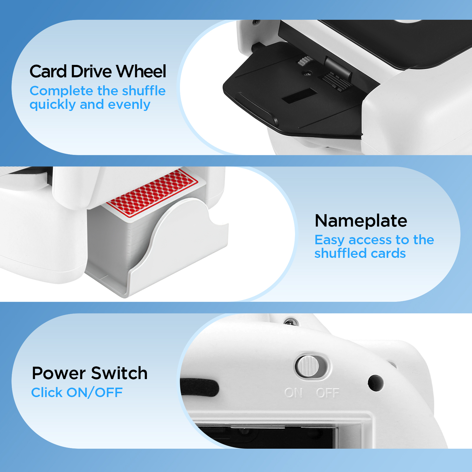 Enkel att använda – passar alla åldrar. Ger ansträngningsfri blandning för alla! Den utdragbara bakre styrvingen passar flera typer av kort som Poker, UNO, Skip-Bo, Phase 10, Bridge, Texas Hold’em, Blackjack m.fl.