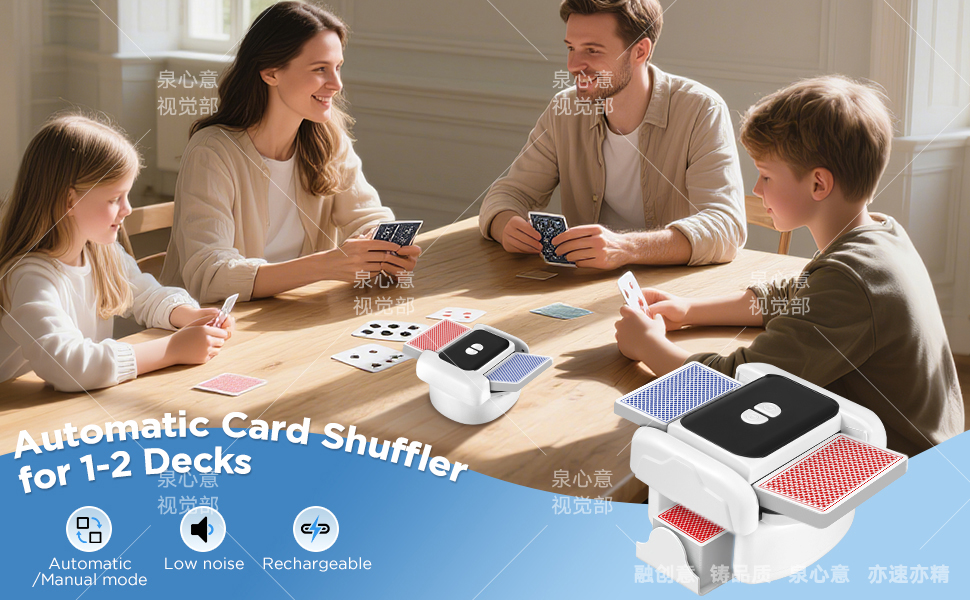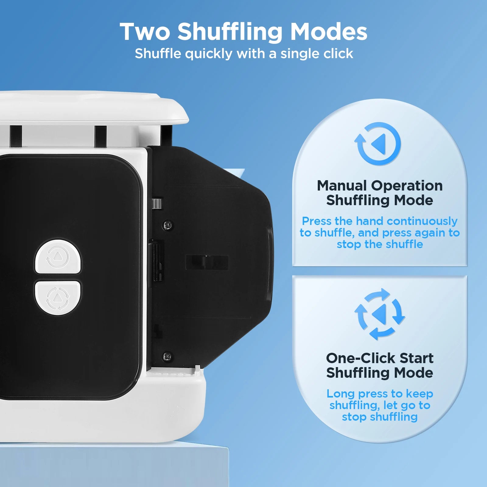Glöm engångsbatterier! Den uppladdningsbara kortblandaren för 2 kortlekar är ett kostnadseffektivt alternativ. Spela i timmar utan att behöva byta batterier – alltid redo när du är det. -