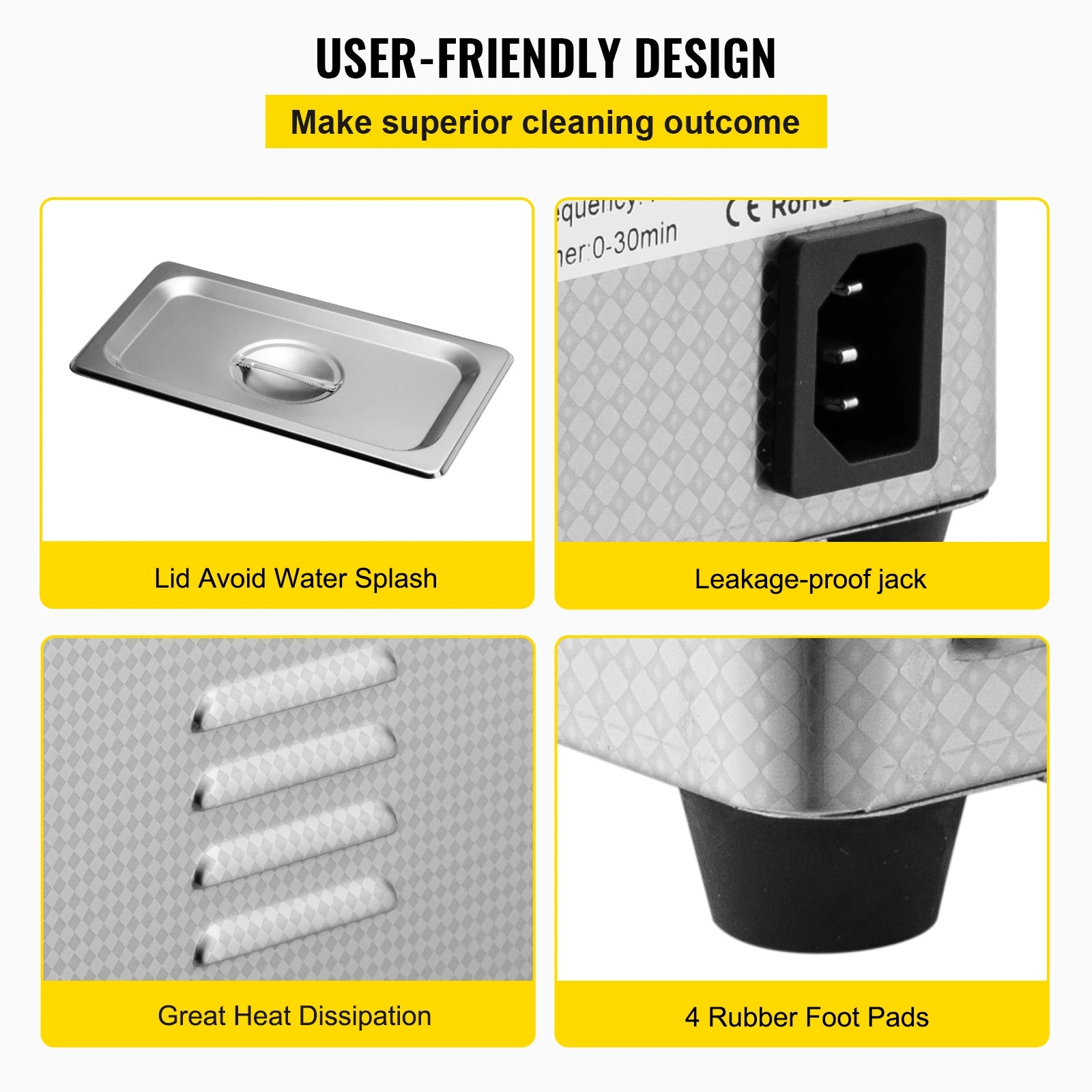 User-friendly Design: Tabletop ultrasonic washer, light-weight and easy to carry/move. It is designed for better customer use: washing basket, safe socket, heat dissipation, anti-slide rubber feet, and top lid with handle.