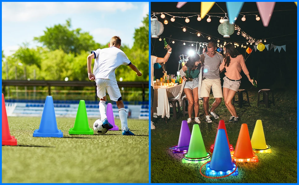 De 6 konerna har strömbrytare för att tända ljusen, och dessutom börjar ljusen blinka automatiskt vid träff av sandpåsen. Perfekt för lek även på kvällen – samtidigt som de blinkande ljusen skapar en härlig stämning på uteplatsen.